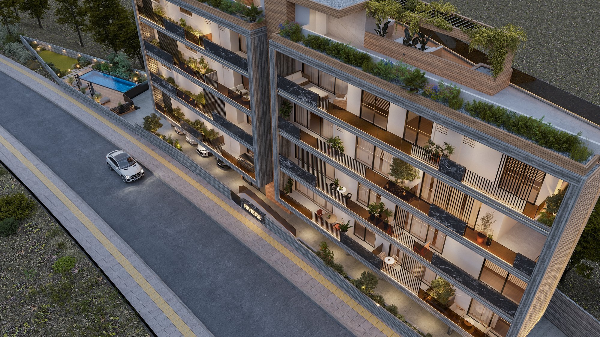 RIVIERE Residences is a modern four-story building with 11 stylish apartments. It offers a range of 1, 2, and 3-bedroom apartments and features a communal swimming pool for residents to enjoy. The highlight of the project is the three-bedroom penthouses located on the 4th floor, each featuring a private roof garden with its own jacuzzi, offering the ultimate luxury and privacy. Each apartment is designed with comfortable bedrooms, a bright open-plan kitchen, living area, and a large veranda, perfect for relaxing and enjoying the views. Every unit also comes with its own parking space and storage room.